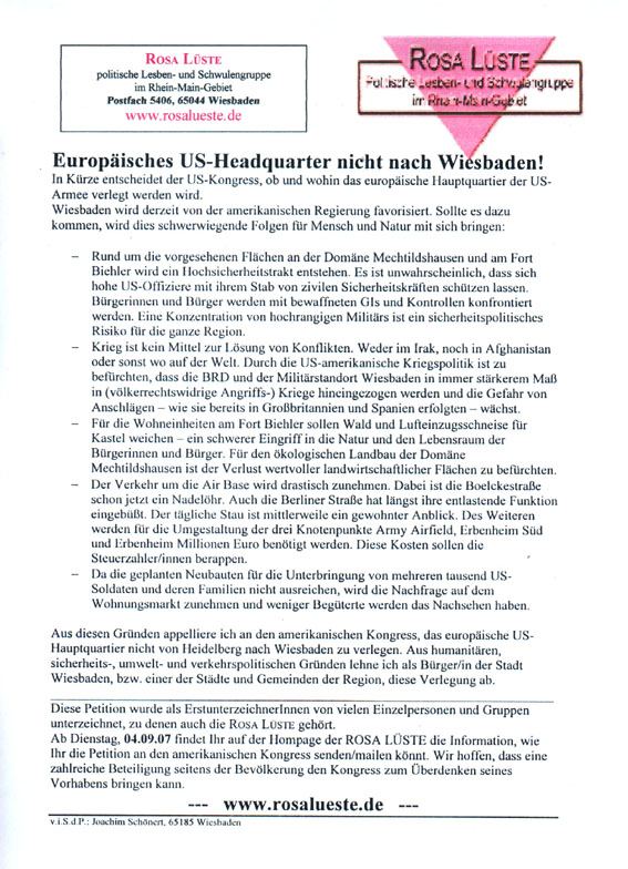 Beteiliging der Gruppe an der Petitions-Aktion gegen das Europäische US-Heaquarter in Wiesbaden!